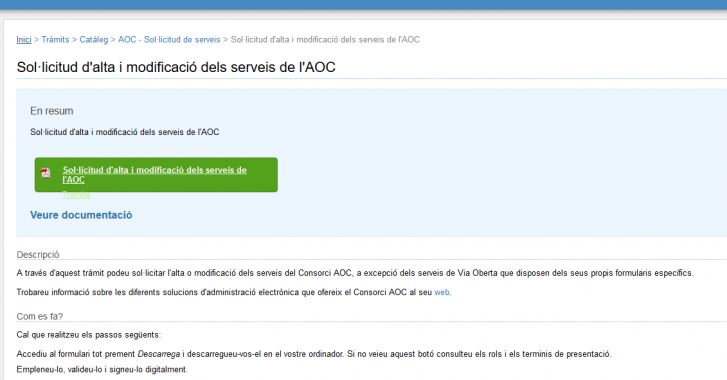 Trobareu el tràmit per sol·licitar el servei, a EACAT Tràmits (consulteu com adherir-vos a EACAT)> prestador Consorci AOC, Servei CAOC – Sol·licitud de serveis > Tràmit “Sol·licitud d’alta i modificació dels serveis de l’AOC”.